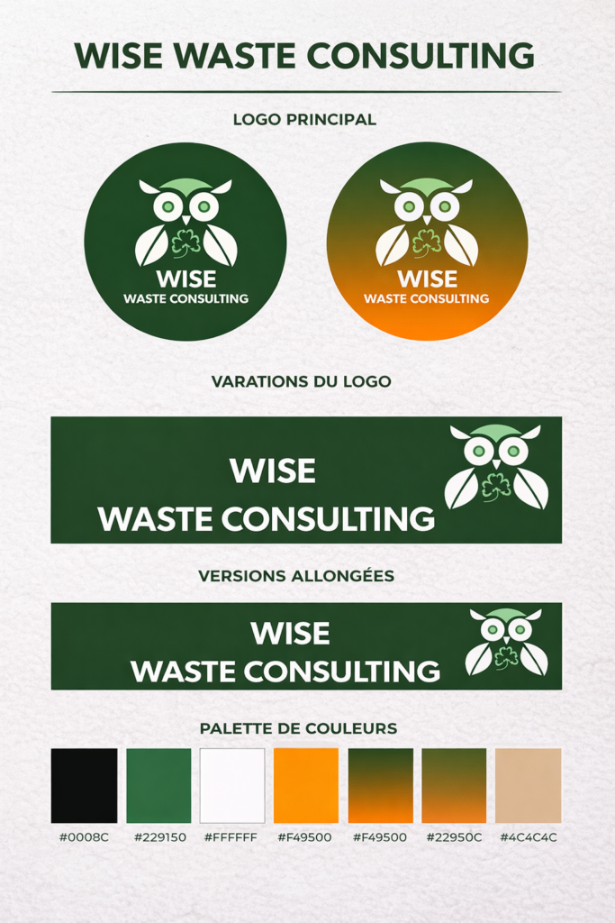 Wise Waste Recycling est un projet de création de logo réalisé pour une entreprise de recyclage basée en Irlande. Le commanditaire souhaitait un symbole fort incarnant à la fois la sagesse et l’engagement écologique, avec l’intégration d’une chouette comme élément central. Afin de renforcer l’identité et l’ancrage local de la marque, j’ai proposé une approche conceptuelle combinant un trèfle, symbole emblématique de l’Irlande, avec les flèches du recyclage. Le trèfle a ainsi été construit graphiquement à partir des flèches, permettant de lier harmonieusement les valeurs environnementales et culturelles de l’entreprise. Le projet a nécessité un travail de réflexion graphique, de composition et d’affinage du logo sur une durée d’environ 10 heures.